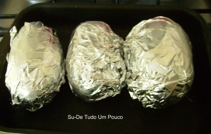 Você lava bem as batatas, não retira a casca, envolve ela em papel alumílio e coloca para assar em forno quente e fogo alto, mais ou menos de 15 a 20 minutos, para você saber se ela está assada, espete um garfo e ele tem que entrar sem esforço.
