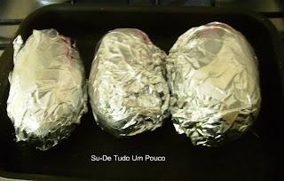 A batata eu fiz de um modo diferente e gostei demais. Eu aprendi com o Claude Troisgros a melhor maneira de assar batatas e legumes e lá fui eu.