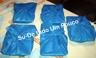 Depois de fechadas as marmitas envolvi em TNT azul para dar um charme.