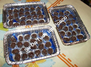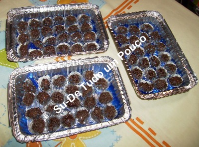 Eu fiz três sabores de brigadeiro: tradicional, cacau puro sem adição de açúcar e de gengibre, passando todos no granulado.