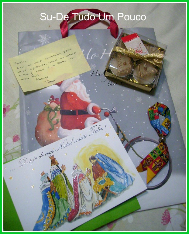 Primeiro ganhei presentes da minha amiga Teresa, lá de Lisboa, nem acreditei quando recebi, saí falando pela casa: é da Teresa, é da Teresa rsrsrs, ela agradou a todos com o seu carinho, com cada palavra e os detalhes.