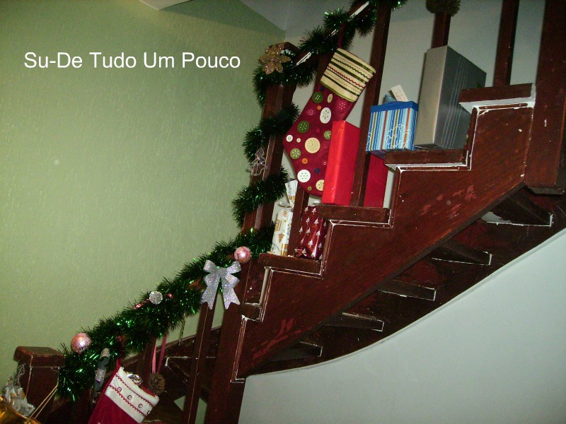 | Estou restaurando a escada, por isso ela está toda feia, mas não poderíamos deixar de utiliza-la, ficou tão charmosa com os presentes espalhados pelos degraus. |