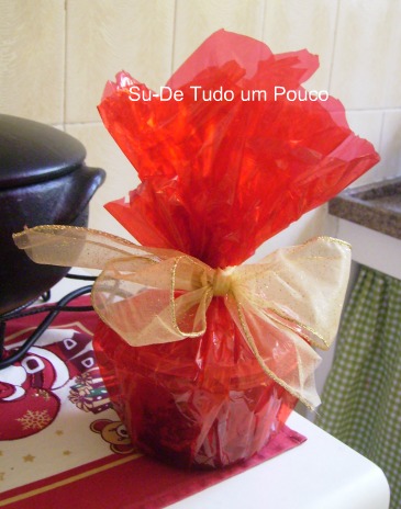 Coloquei um pouco do antepasto que fiz em uma vasilha e embrulhei para presente, a Ju foi entregar, ela amou !!!!