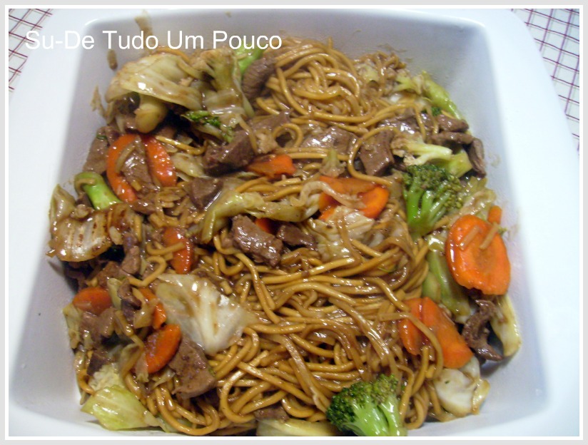 Depois que a carne estiver frita, misture na panela dos legumes e vá mexendo e por último acrescente o macarrão com um pouco mais de shoyo.