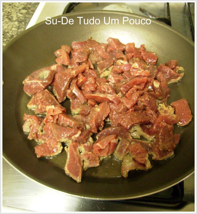 Cortei carne em pedaços, pode ser Filé Mignon ou Alcatra. Coloque para fritar em óleo quente.