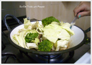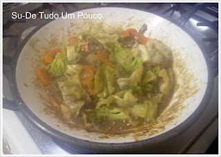Em outra panela coloque os legumes picados, eu usei aquele que já vem pronto para yakssoba em saquinho, apenas lavei e coloquei na panela, com 3 colheres de sopa de shoyo, uma colher de sopa de maizena diluída em 1 xícara de água e 1 pitada de sal, vá mexendo até tudo murchar.