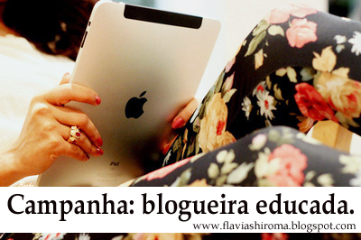 "O intuito deste selo fixo de campanha "Blogueira Educada" é promover a harmonia na blogosfera. No nosso dia-a-dia é natural seguirmos alguns padrões de boa conduta pelo bem de uma convivência calorosa e sadia. No mundo virtual isso também pode ser feito. Vamos espalhar pelos quatro cantos que a educação deve existir também no mundo dos teclados e que o respeito às idéias de cada blog deve estar acima de tudo".
